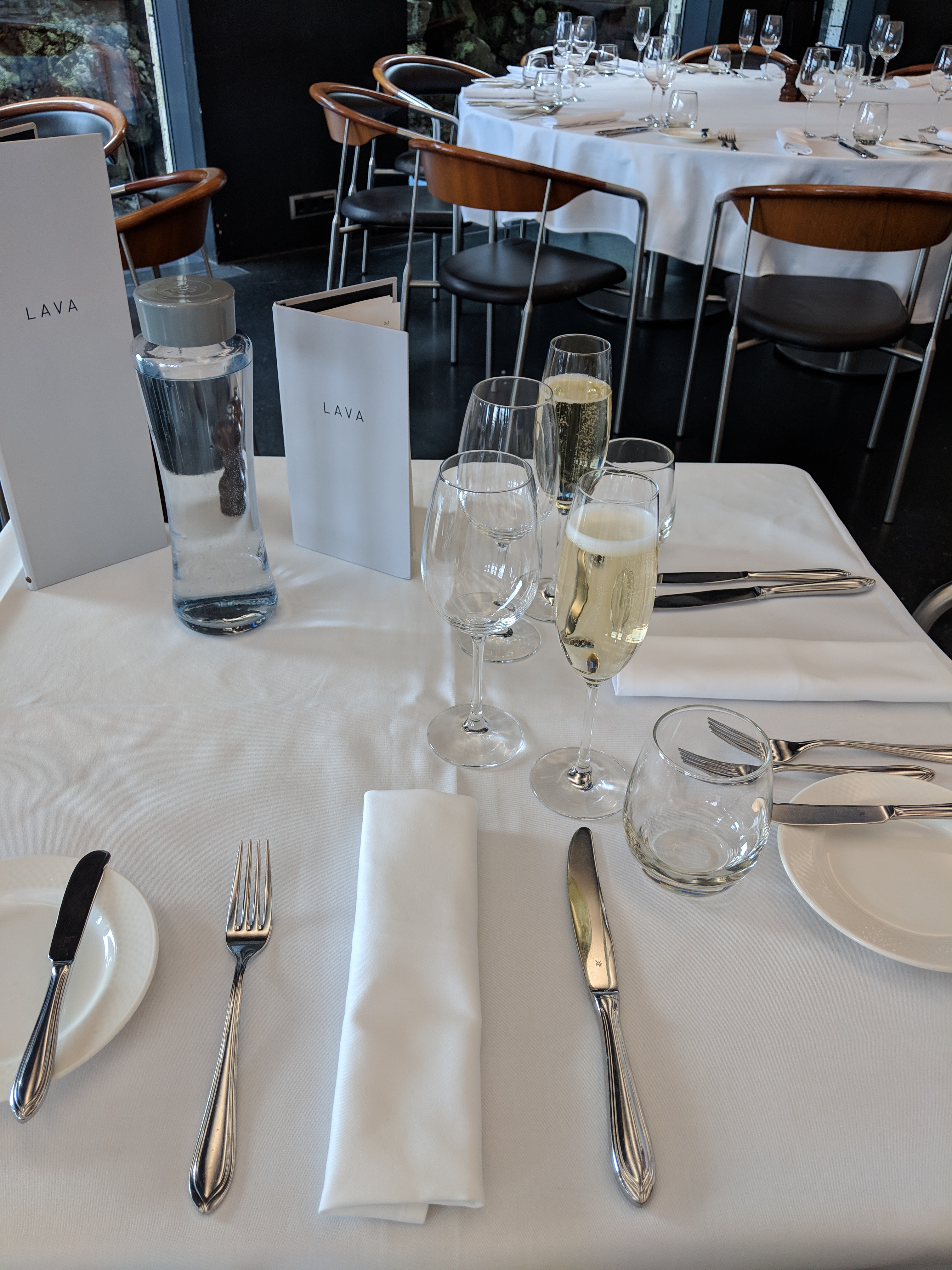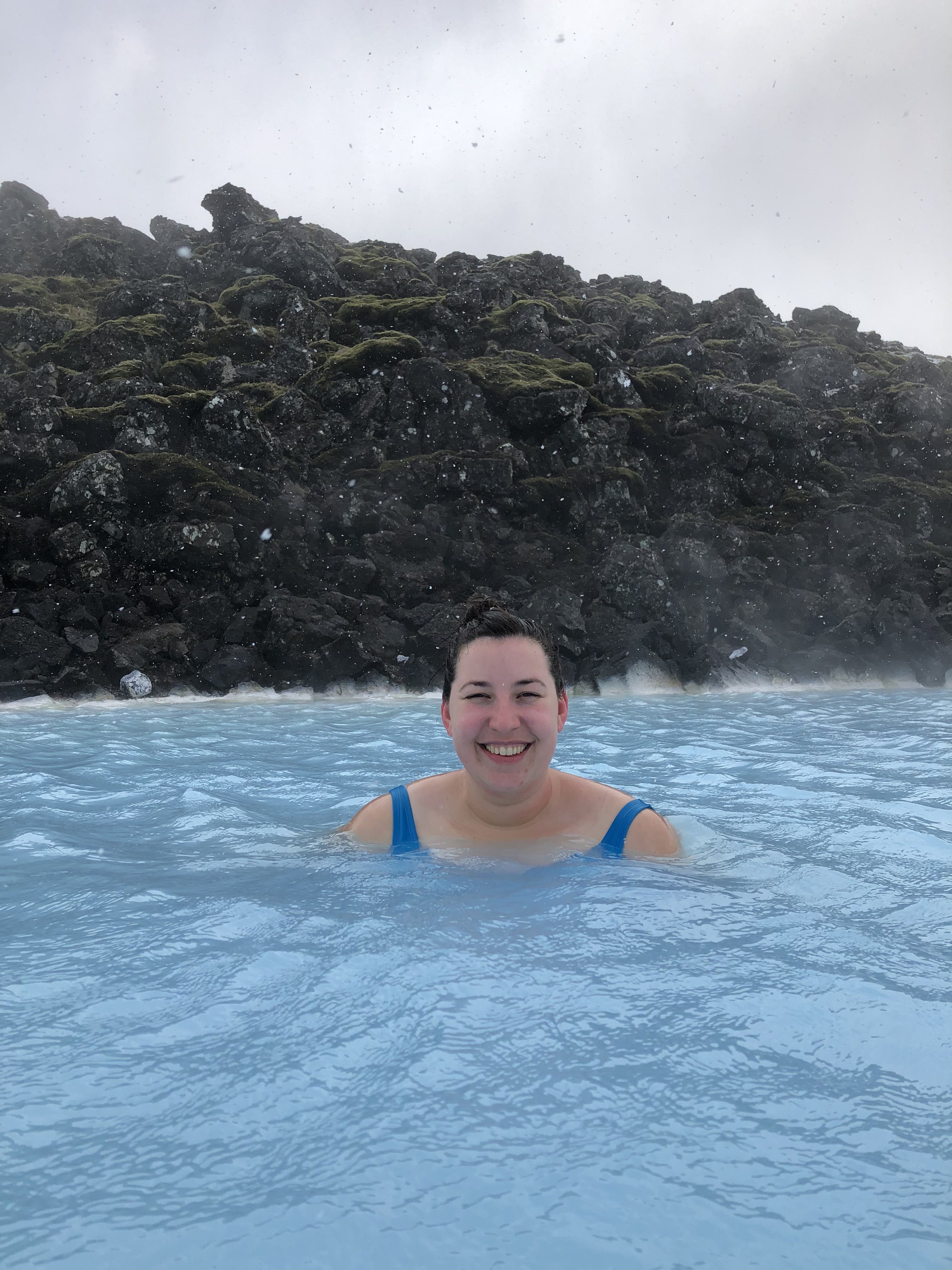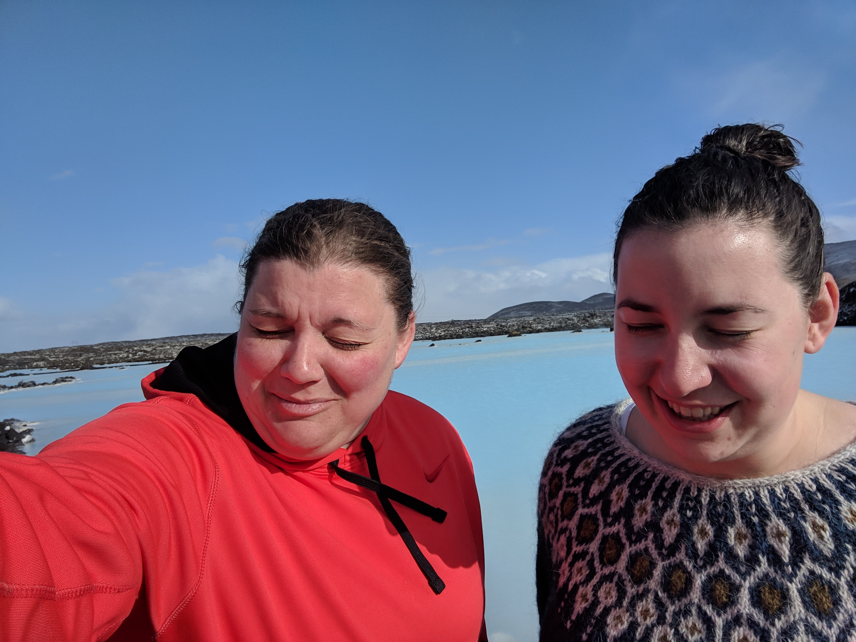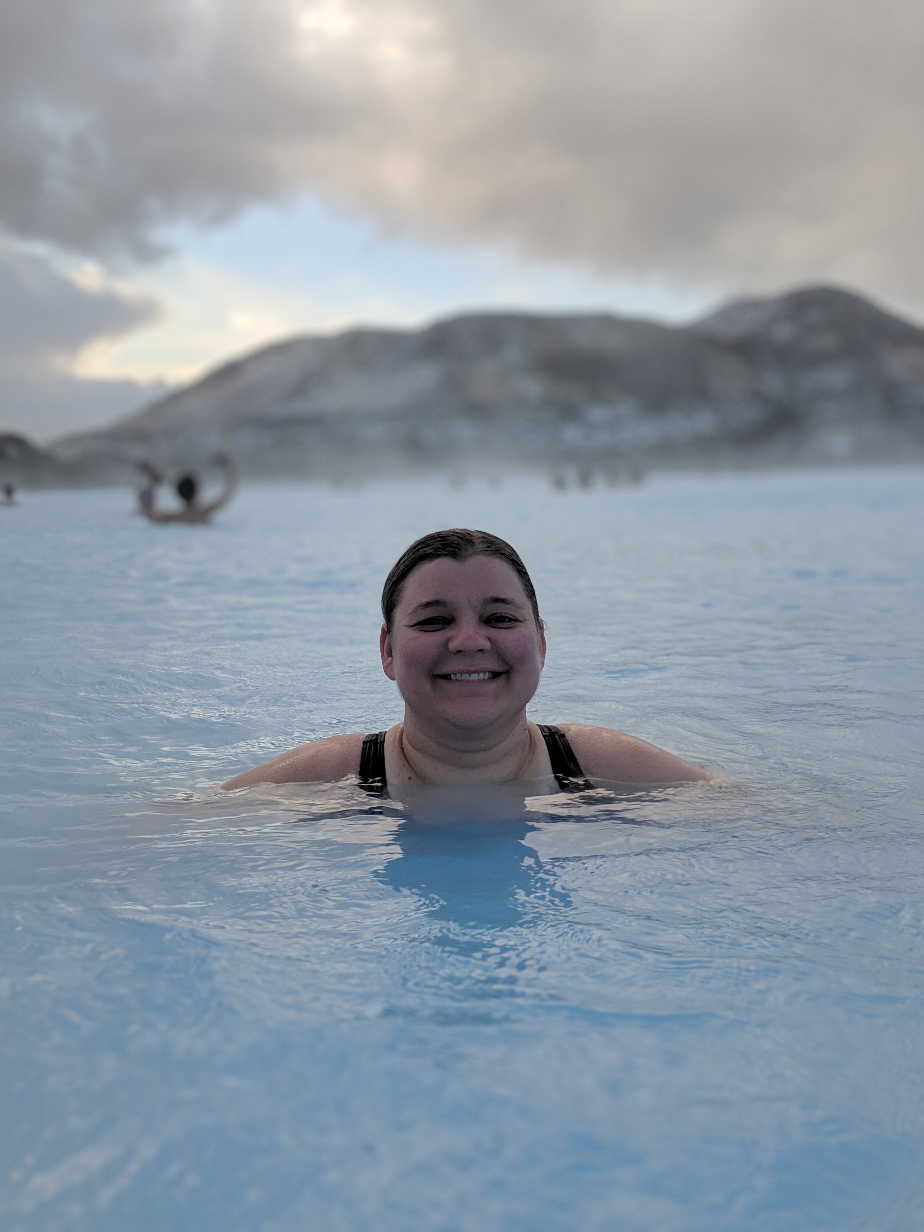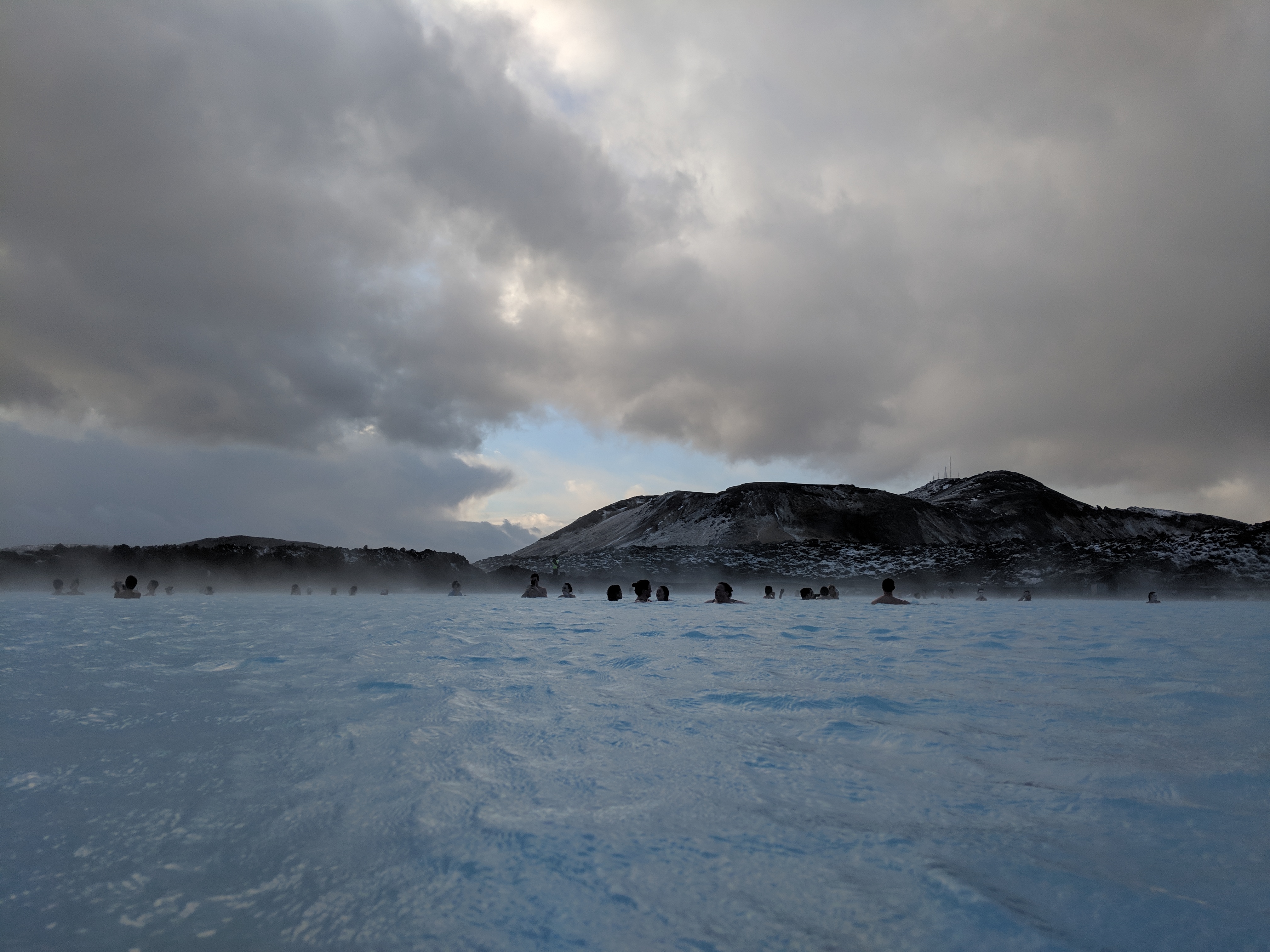 After about 10 minutes we were over holding our phones above the silica heavy water. So, the phones went back into the locker. We came back to the lagoon and headed over the face mask bar. We got Silica masks and you are supposed to leave that on for 10-15 minutes, but it is COLD!! Cold because of the wind blowing off over the ridge hits the mask and freezes your face. I could only handle it for like 2 minutes before I started taking it off. Lauren was a champ and made it the full 10 minutes. During that time I got more mask and put it on again. Made it a bit longer this time. We waded the water for a long while. We got some “pure Icelandic water” they had a little spigot of fresh water under one of the bridges. (Also ice old). We tried the steam room, it was pretty cold; and then off to the waterfall. The waterfall was like a massage for your shoulders, the weight of the water pelting your muscles was great. Lauren didnt care for it as much as I did.