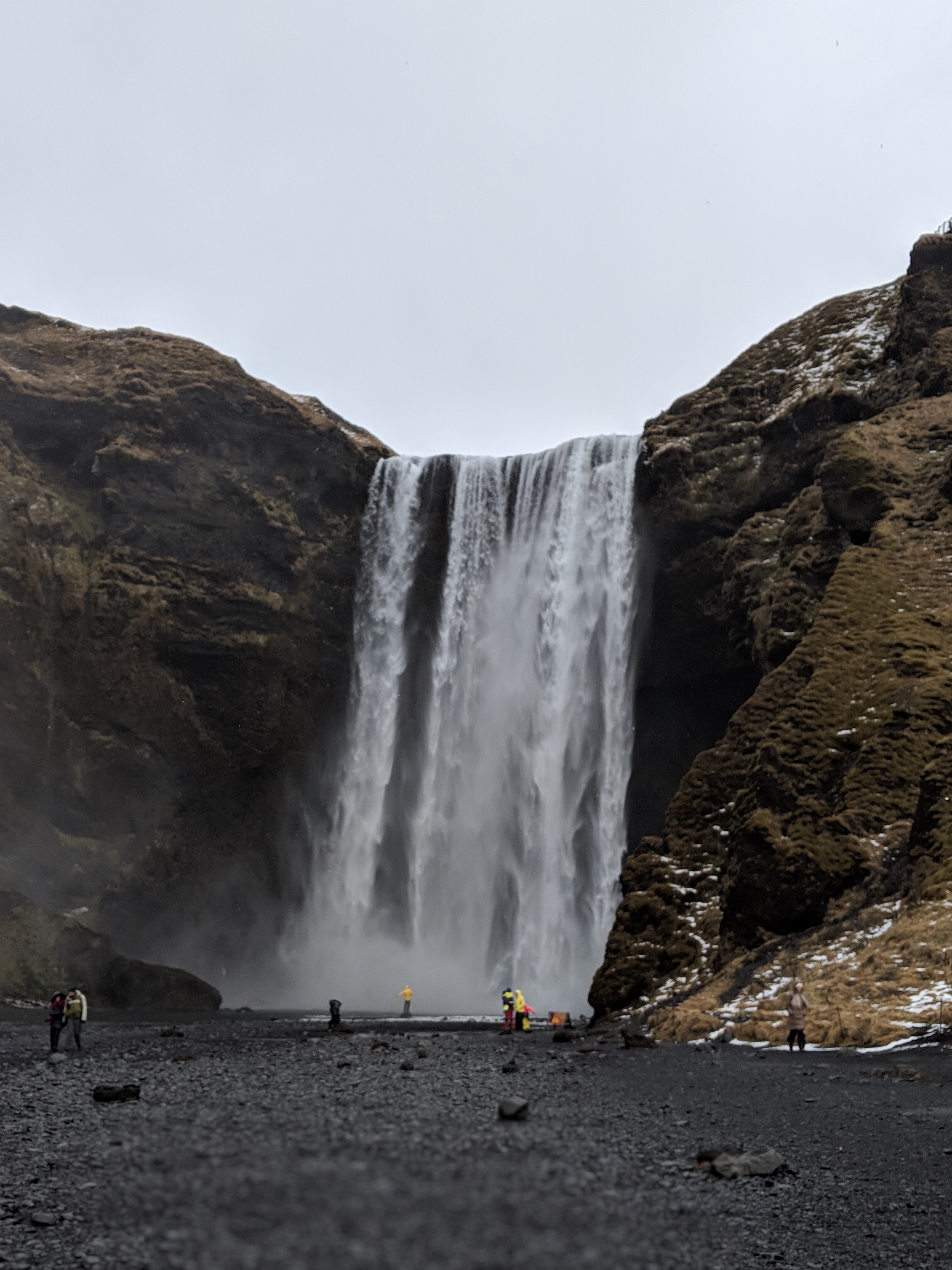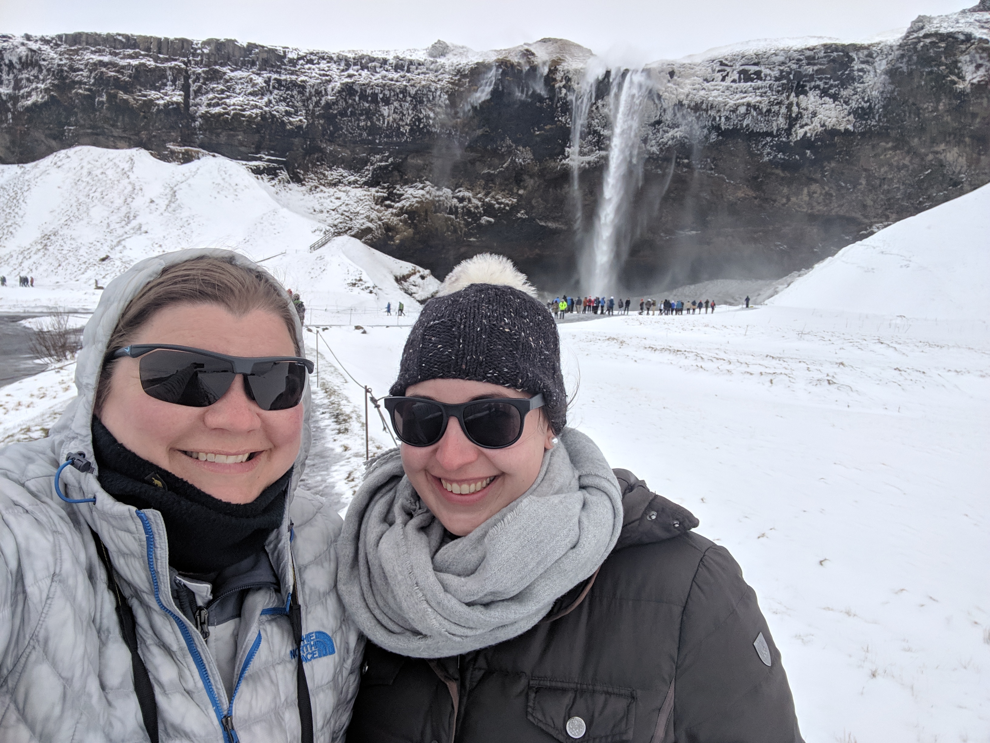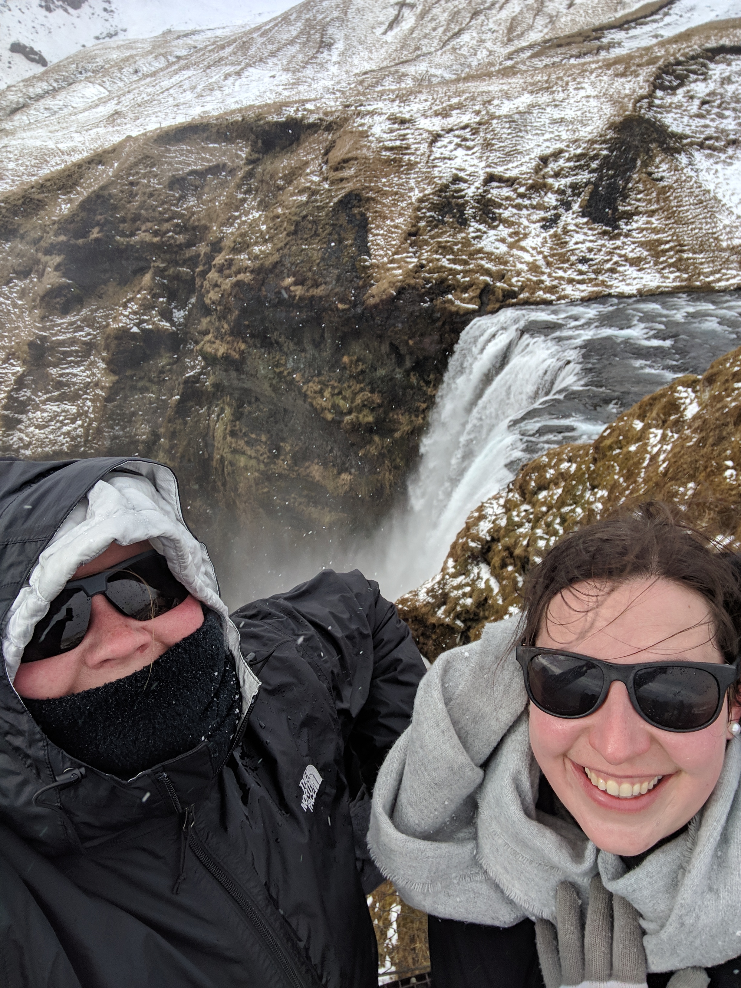 Ok, back to our drive. We were listening to a podcast and Lauren noticed a waterfall off to the left. We decided to stop and see it, why not, we are on a road trip to see as much of Iceland as we can!! Well, we werent the only ones, turns out its a pretty big waterfall stop for tours and such. We had to pay for parking and then got to walk the area and check out the waterfalls. We are starting to realize that people and their snow pants/water proof pants are smarter than they look. There was an opportunity to go into a cave area, but you would get soaked. I was willing to go in, its just it was way too busy and people were just hanging out on rocks to wait their turn. So instead we headed back to the car to continue on our way. It was a beautiful stop!!