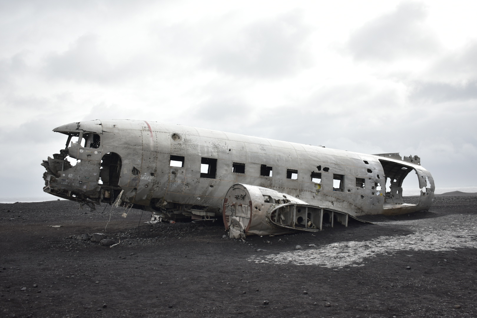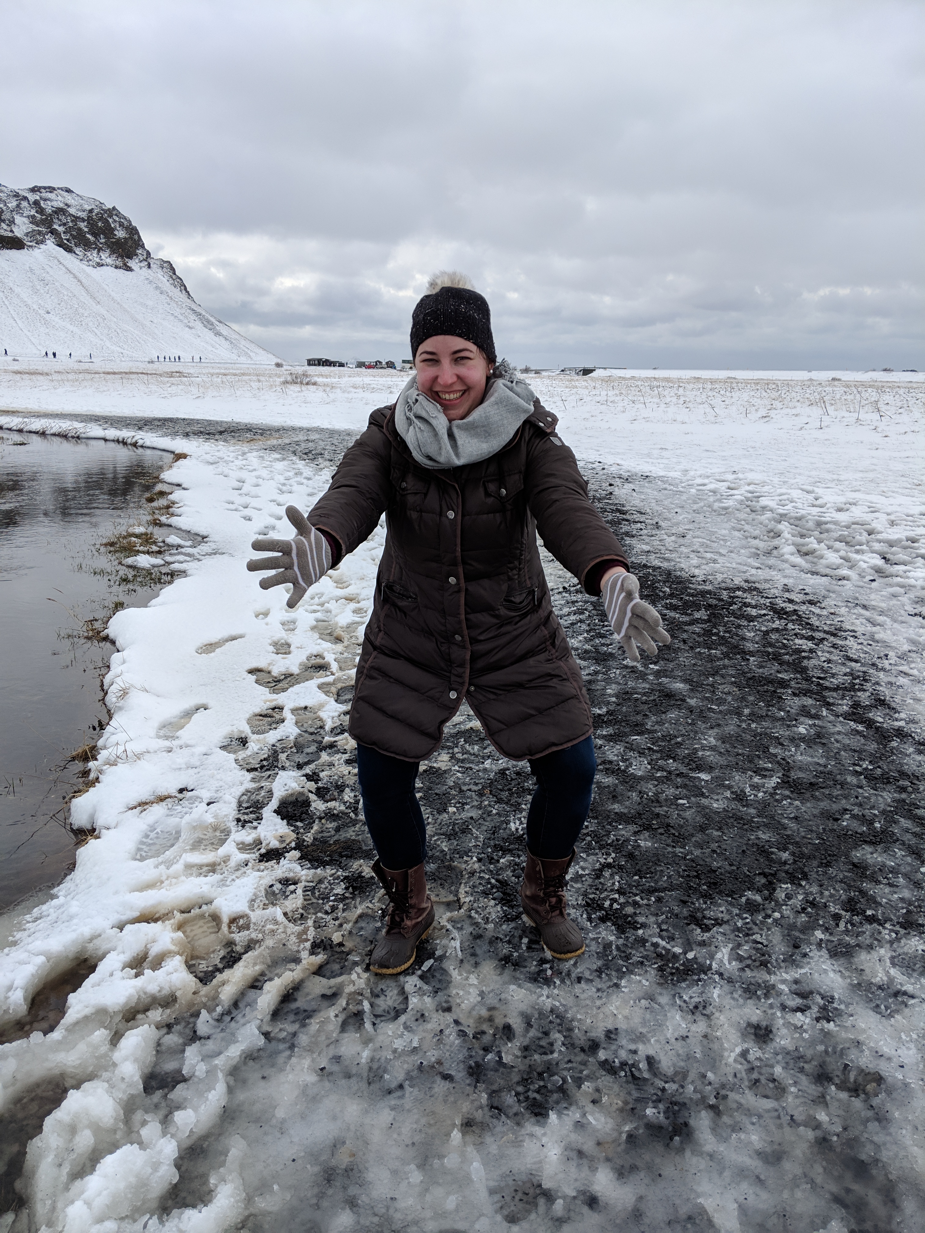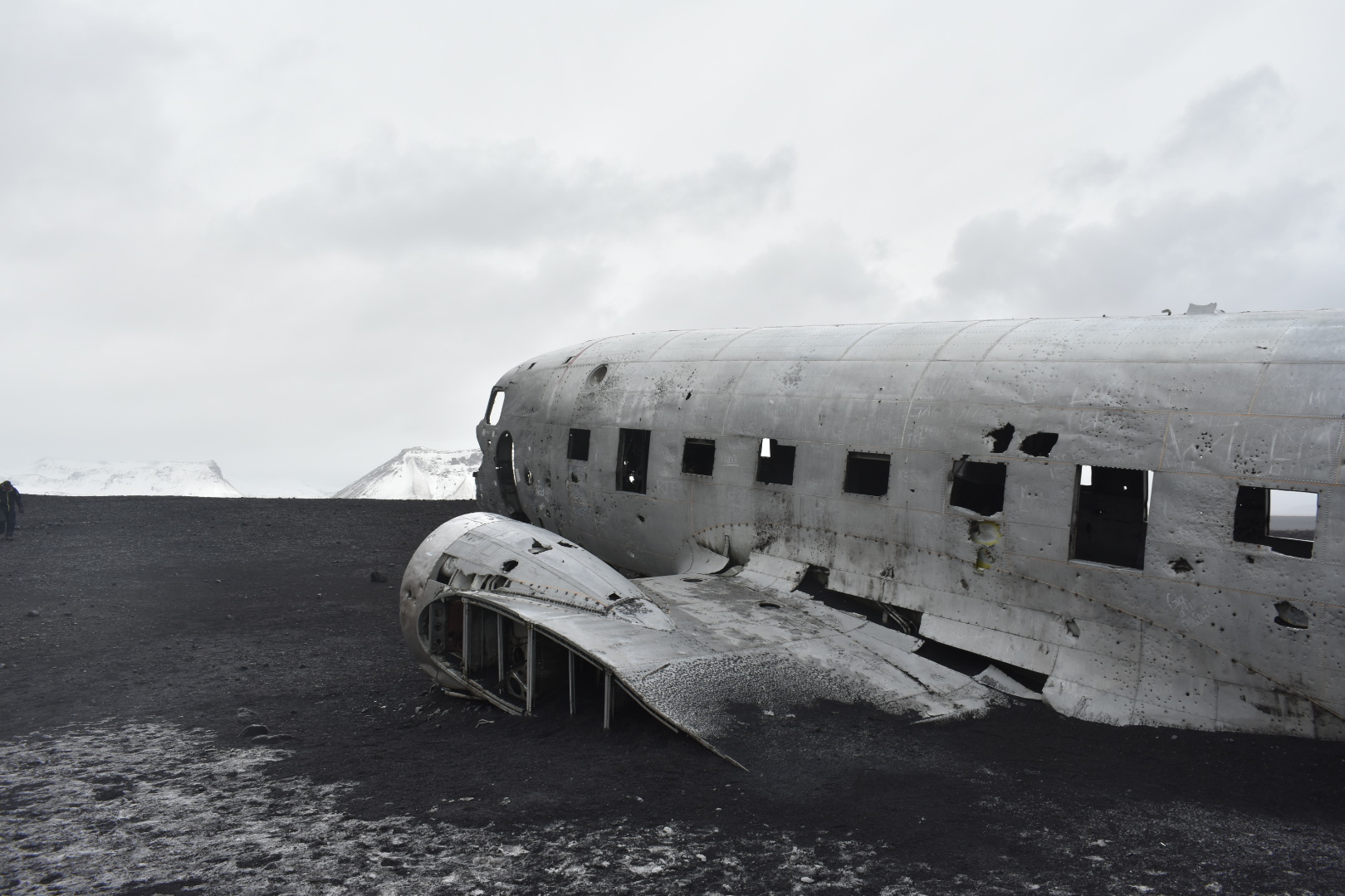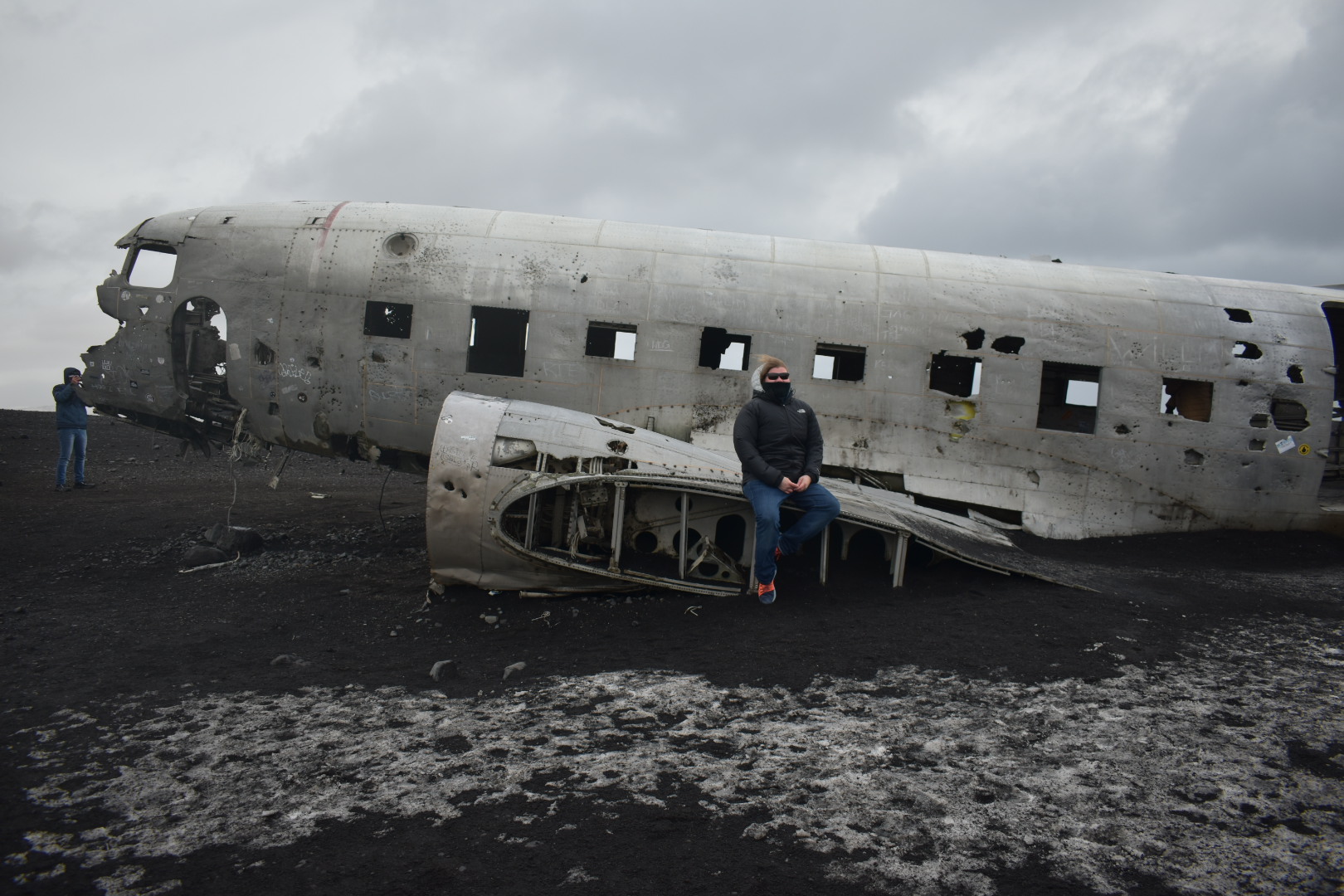 It was about 230pm at this point. The reality that we wouldnt be making it to Hofn today. We were discussing options of things to do when we came upon a parking lot on the right side of the road. Lauren realized this was the DC3 plane that I have wanted to see this whole trip!! WOOHOOO!! I didn’t think we would make it!! And it looked so flat to get out there, I was even able to talk Lauren into coming with me….until we got out of the car!! Then the wind WHIPPED!! And the frozen rain pelted, and she went back to the car. And I, ran to the bus that charged you $27 to take you out the 2.5 miles to the plane. And let me tell you, best $27 I have spent, because the wind was so intense. Lauren said when I came back she didn’t know if I was going to get to see the plane because the weather was so crazy. When the dropped us at the plane, we had about 2 football fields to walk to get to it. There were only about 15 of us total there, and about 40 people who were crazy enough to walk the whole way. The wind was intense enough that it almost knocked me over at one point. And when you lean into the wind so you dont get pushed over its perfect, until the wind just stops and you almost fall over in the opposite direction!The DC3 plane was eerie. And weird. No one died during the crash landing. It was a US Naval plane, all 5 members survived the crash. Rumor has it the pilot switched to the wrong fuel tank and ran out of gas and they had bad weather so they crash landed. Anyway, the plane is just sitting there on a black sand beach. Nothing around for 2.5 miles (the parking lot now). I loved this place. I am so happy I got to do this!!
