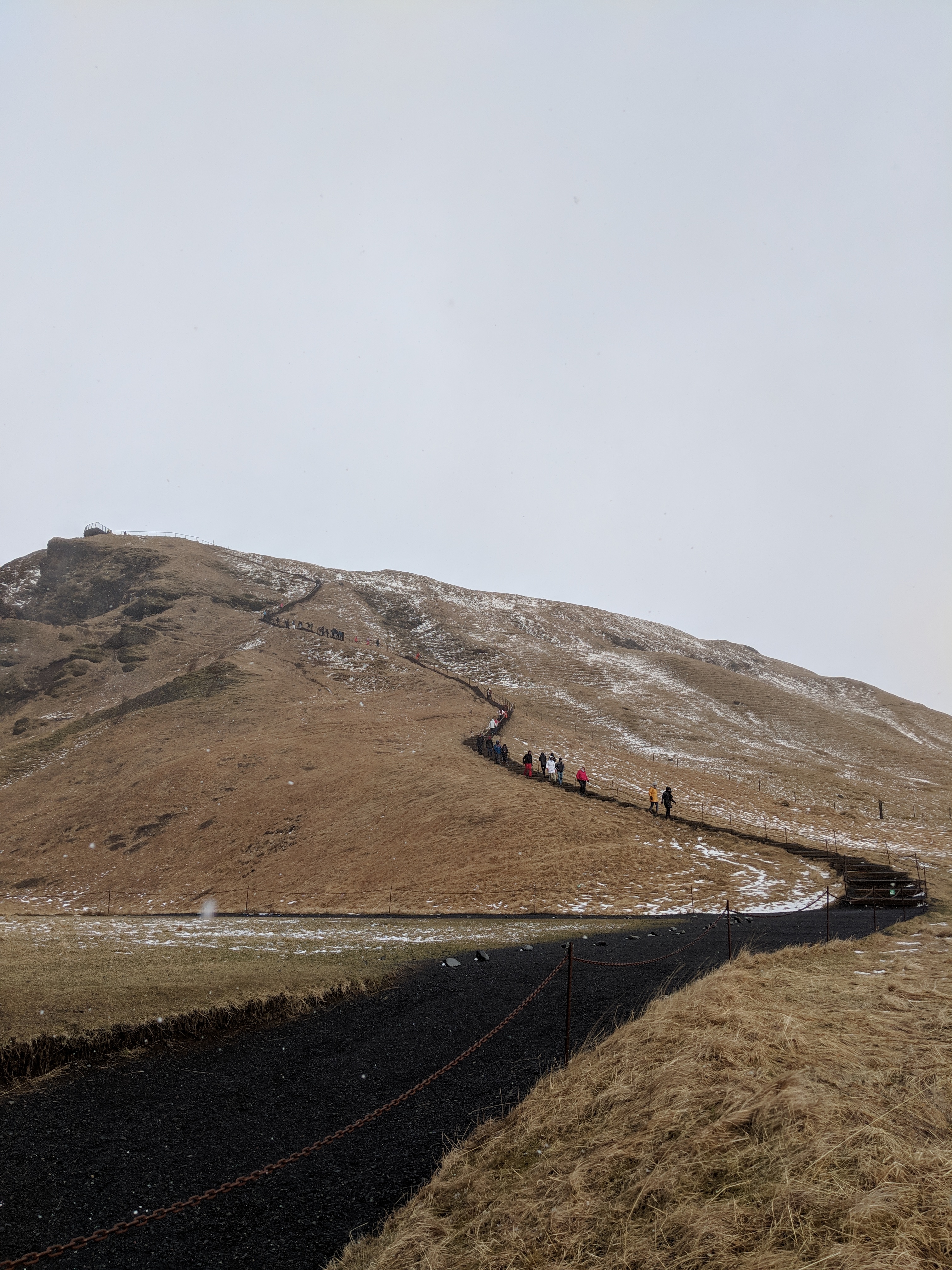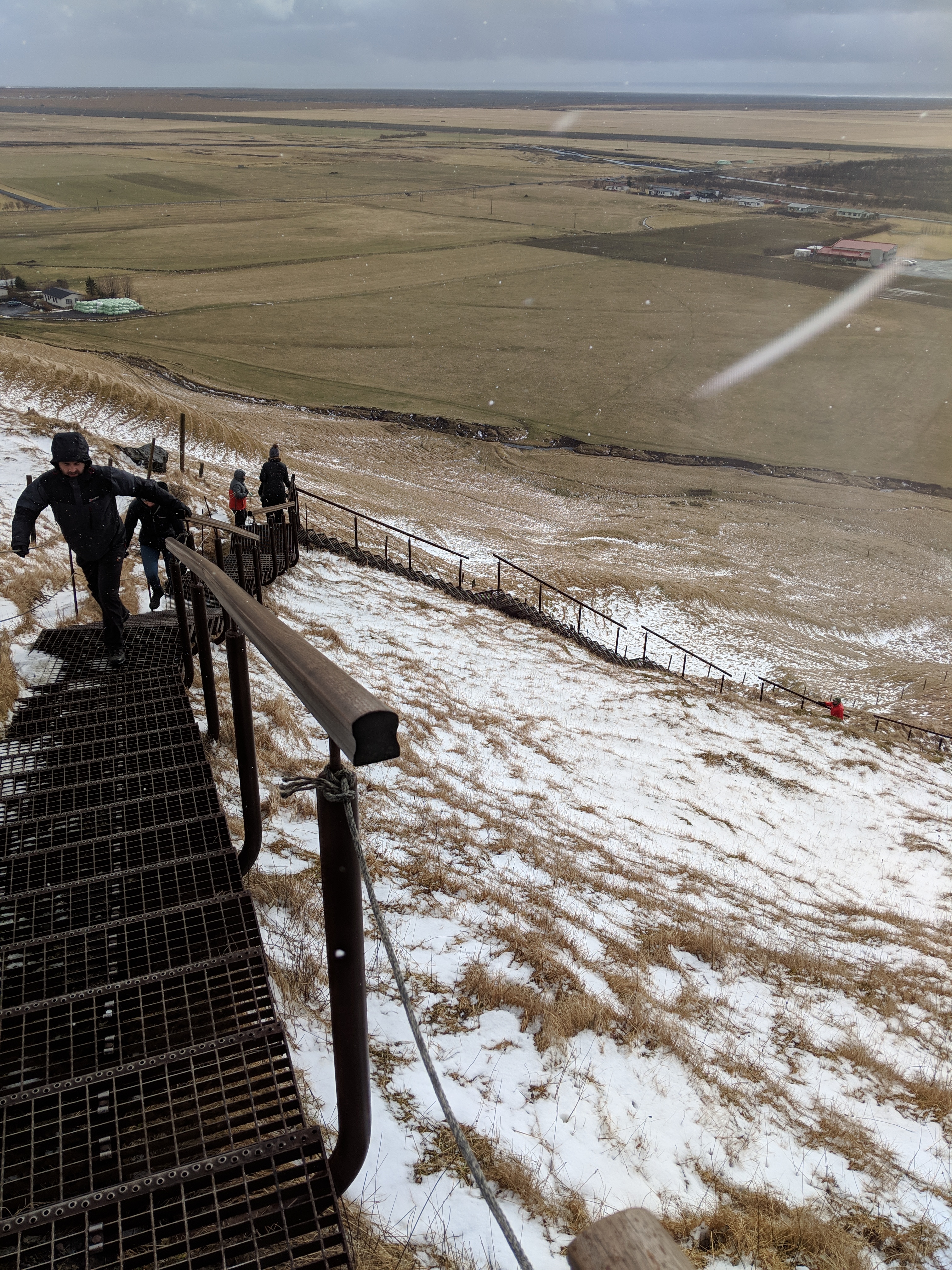 On the road again….our next stopping point was Vik. Our hopes was that we could make it all the way to Hofn still, but time was ticking and we were getting ready for the worst. Again…Lauren noticed a waterfall off to the left, so of course, we had to go. And guess what?? You could climb to the top!! So we had to climb. I promise you Lauren would NOT have climbed if I hadnt been there, but Im glad we went up. It was INSANE. The wind had picked up by this point, like dangerously so. The rental car lady had warned us to hold our car doors when we get out, and she wasnt kidding. None of the insurance covers doors going the wrong way, so we had to hold on carefully. We bundled up in rain jackets, sweaters, gloves, scarves, etc. and took to the stairs. LOTS AND LOTS OF STAIRS. We made it to the top, took a couple pictures and then headed down. Im not sure I can describe the wind enough for anyone who wasnt there to understand, but maybe my Aunt and Uncle in Florida would, hurricane force winds and all. On our way down a gust of wind knocked a girl off the stairs (parts only had rope hand rails) and she screamed. Luckily, her fall was all of 2 feet into grass, but still, thats how strong it was. We hustled back to the car to warm up and continue on our way.