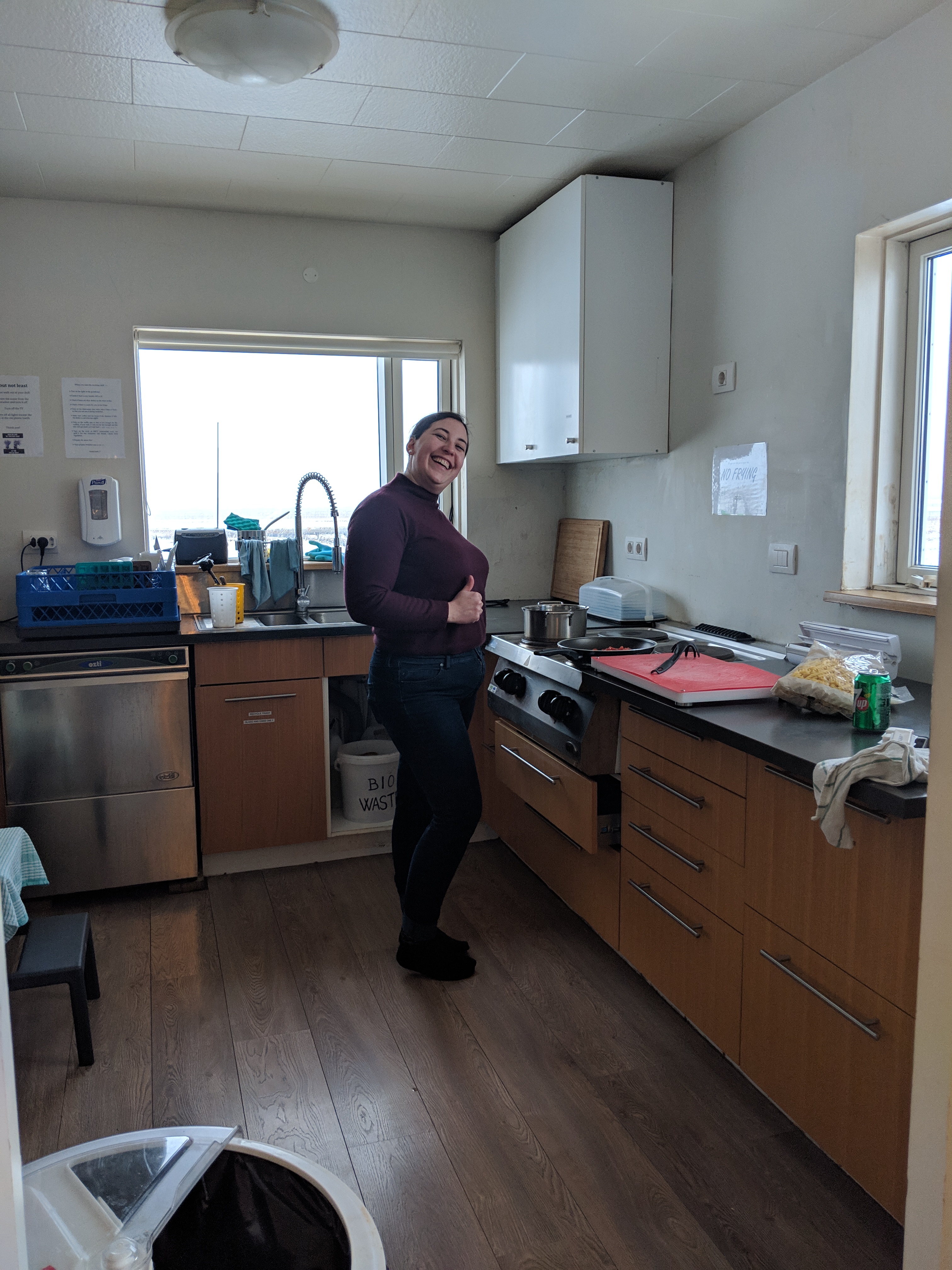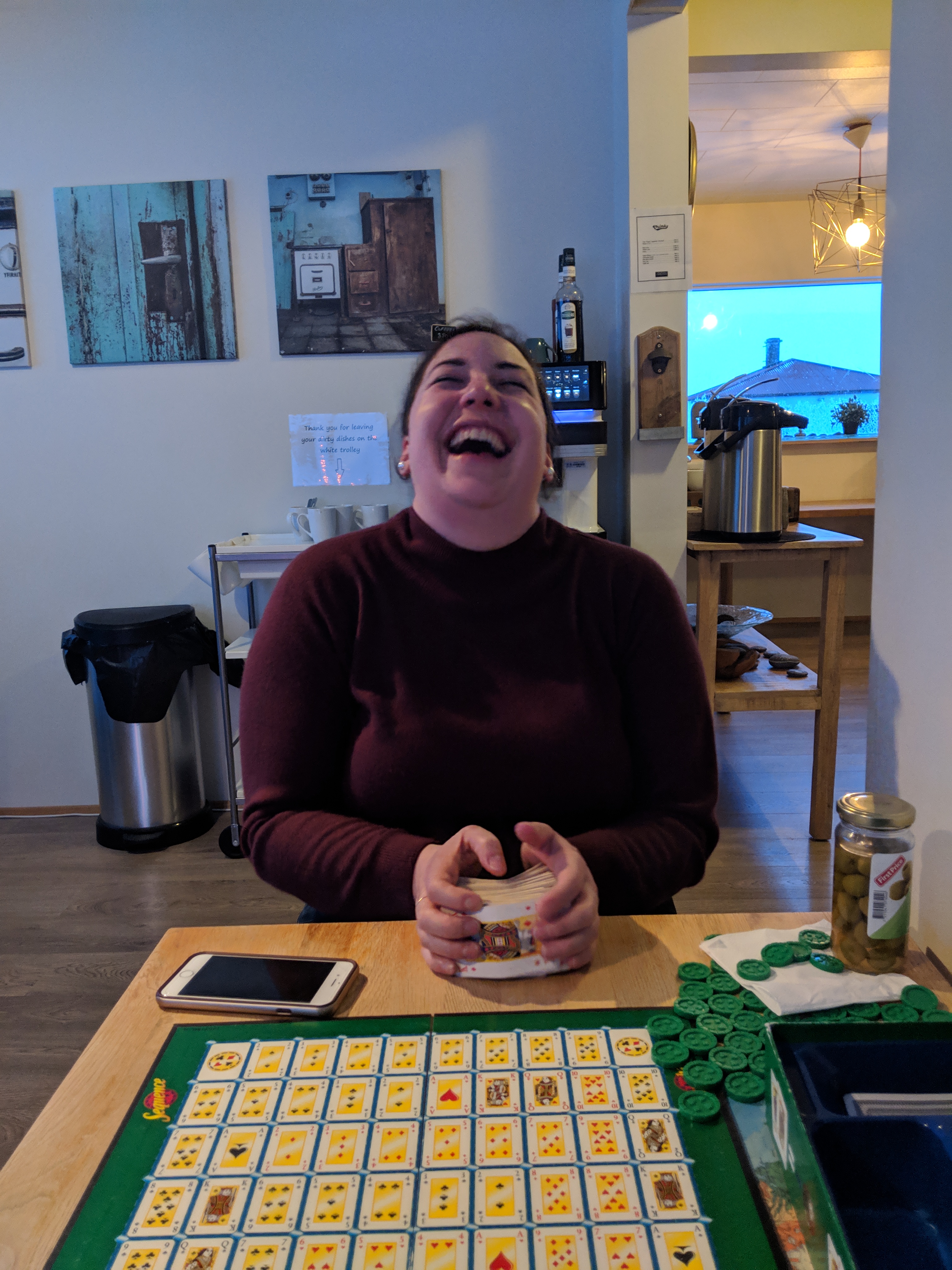 It was here in the parking lot once I was back that we changed our Airbnb to tomorrow and were on a mission to find a place to stay tonight. That actually wasnt the easiest thing to do. We were about 20 minutes from Vik and most of the hotels and Airbnbs were sold out for tonight. Luckily with 4 different apps we were able to find a place called The Farm House. It was 7 minutes from the plane parking lot. And let me tell you – we won!! This is a win for us. We got a great room, private bathroom (many of the places available did not have that option) and a kitchen. We checked in and the host recommended we hustle to go get food if we wanted to (it was now 4pm) because the roads would be closing soon – ya know hurricane force winds and all. So we “booked” it (at about 50kph) and got some pasta (duh), crisps, cheese, sauce, and a 7up for me. When we got back we cooked up our yummy food and enjoyed a hot meal in for the night! After dinner we played Sequence and I got killed again. But it was fun to learn a new game!
