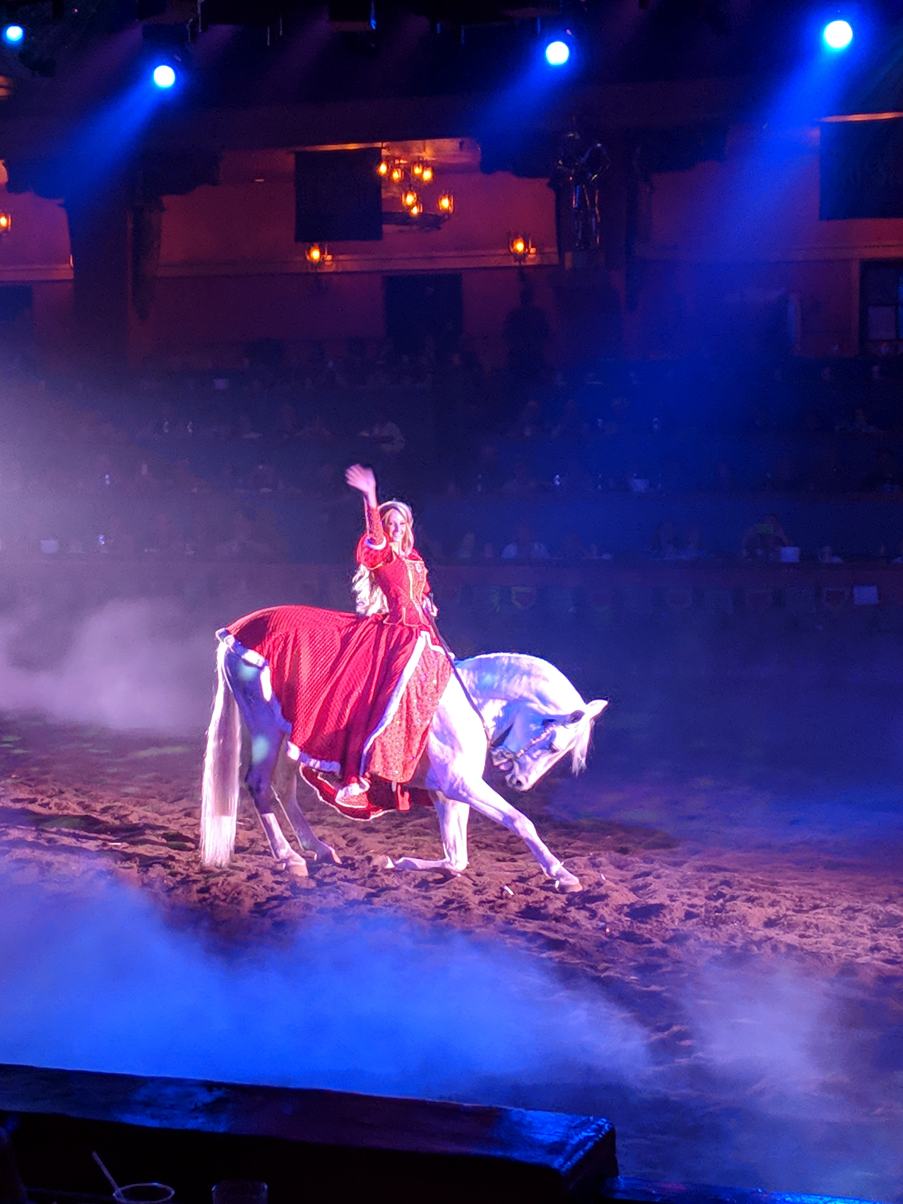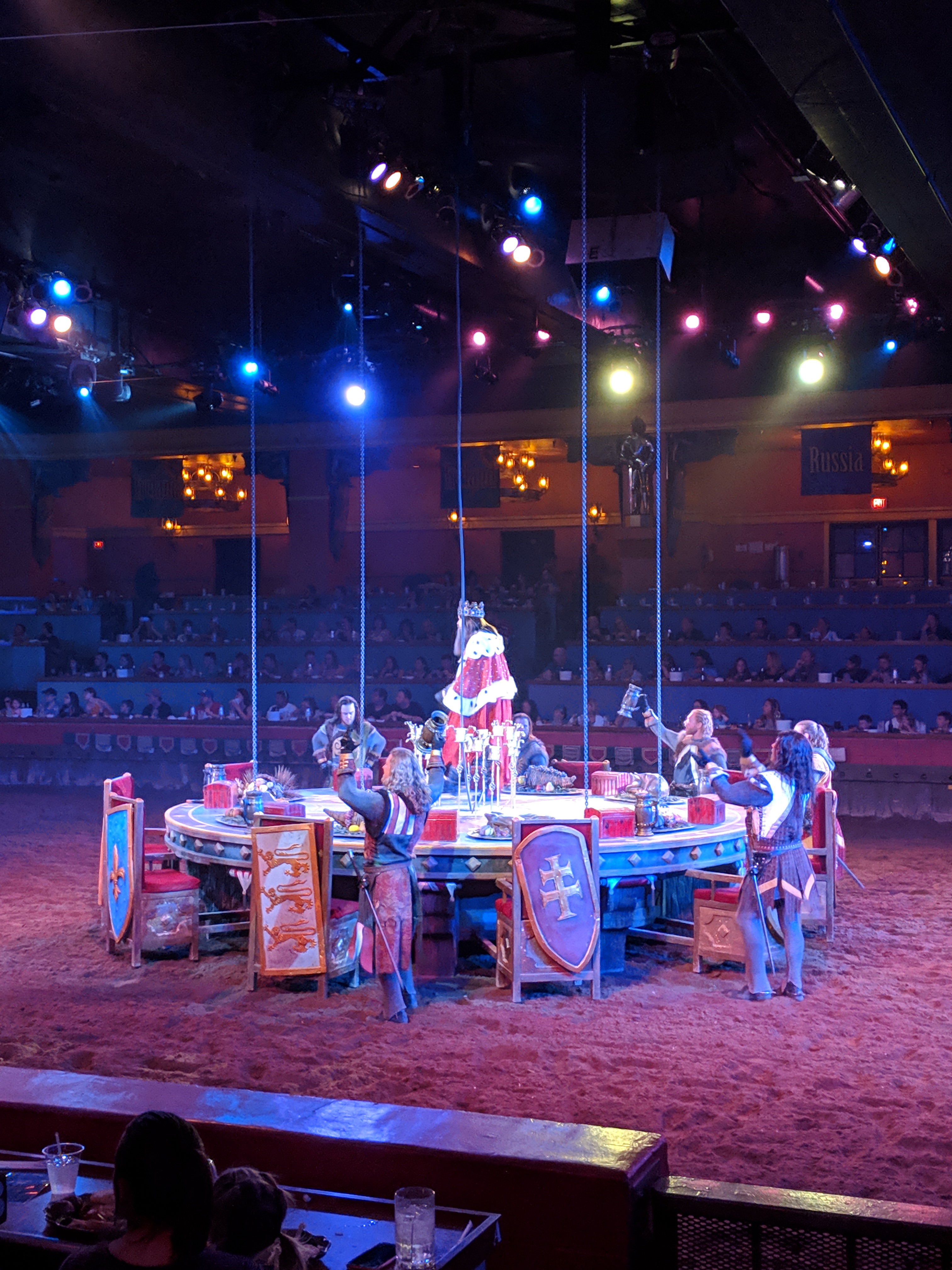 We came, settled in and then had to head out to the Tournament of Kings at Excalibur. Kristi’s brother is in the show and he got us tickets to check it out. Sadly, he wasnt performing last night, but we enjoyed the free meal and the show. We got called out for not being excited enough and had to act excited in front of the whole audience. The experience is like Medieval Times. For the meal you get a cup of tomato soup, a Cornish game hen, potatoes, broccoli, a biscuit, and apple cobbler- but no silverware! Which means you sip the soup and no butter for the biscuit! Hen was a bit dry (ok lots of dry) but I was hungry, so I finished most of the white meat. The soup was the best part for sure!! The show was pretty good!