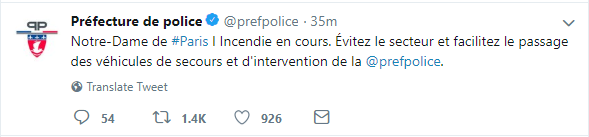 Translated that means : “Notre Dame Fire in progress. Avoid the area and facilitate the passage of emergency vehicles and intervention of the @prefpolice.”