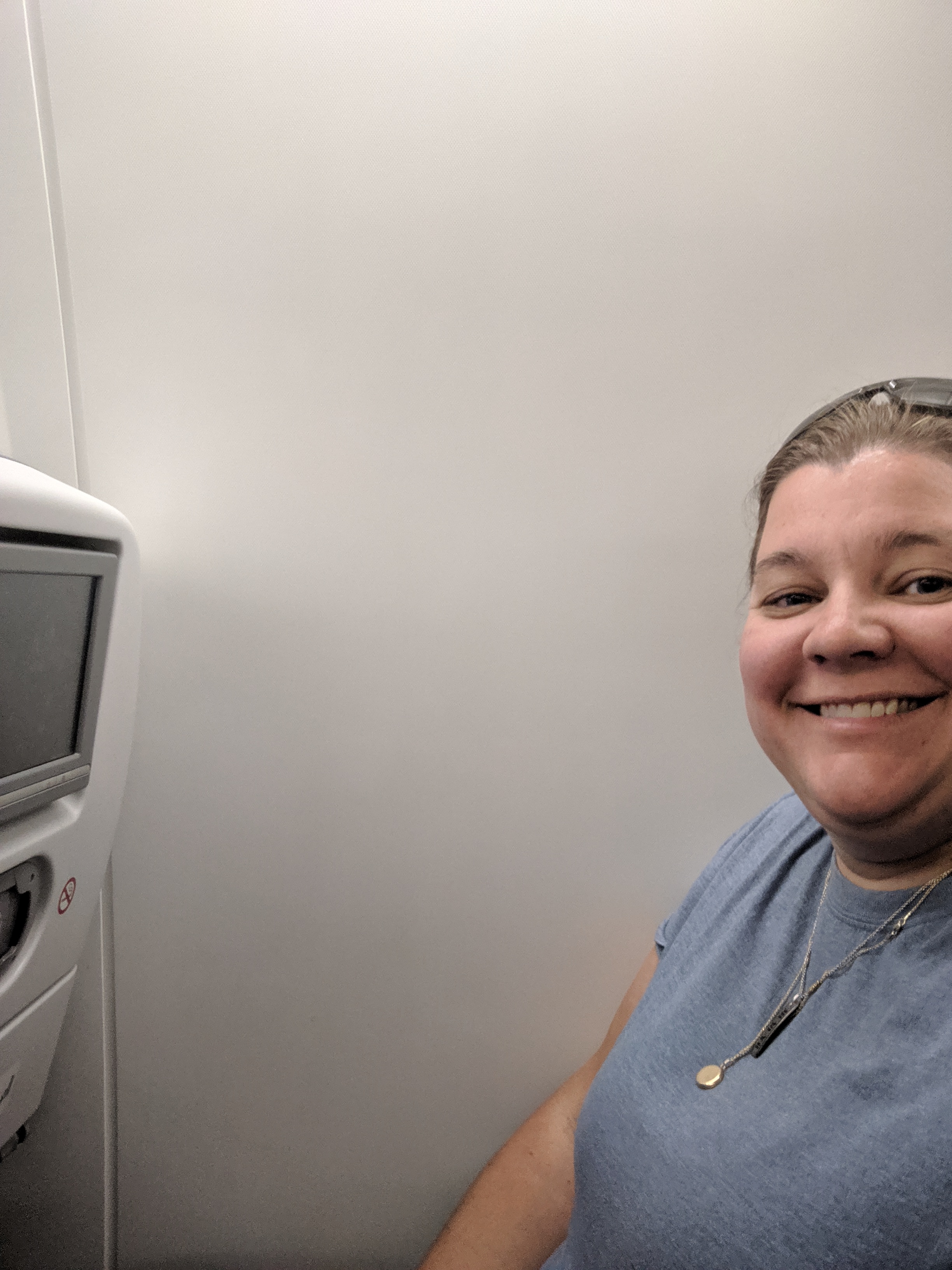 I hit 10,000 steps (insert happy dance here) right as boarding was to begin. I saw some people queuing – they call that “gate lice” in Passenger shaming terms – and I wasn’t going to be one of them. They announced that the systems had crashed and that there would be a delay in boarding. It only lasted about 10 minutes, but once we were able to board, it went very slow, the computers were running slow and there were only half the amount of check in computers available. Because of my Platinum status on American I got to board with the elites on the flight – well after first class of course.