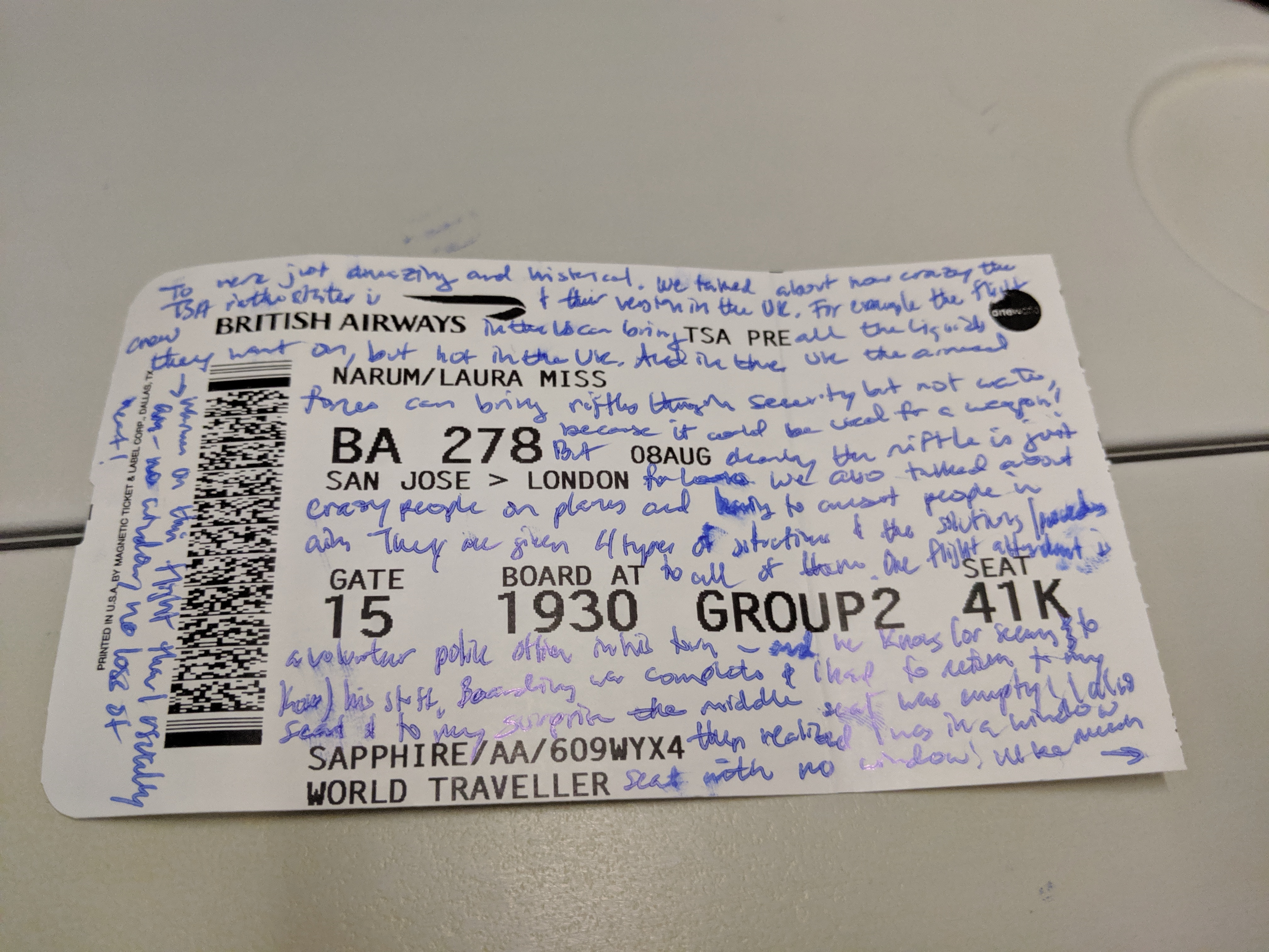 The flight attendants I talked to were just amazing and hysterical. We talked about how crazy the TSA regulations in the states are, as well as the UK version. For example, in the States the flight attendants don’t have a liquid allowance, but in the UK they do. And in the UK the armed forces can take their riffles and guns through security as long as they have a pass, but they cannot take water, as it may be used as a weapon – as opposed to the guns they have with them?!