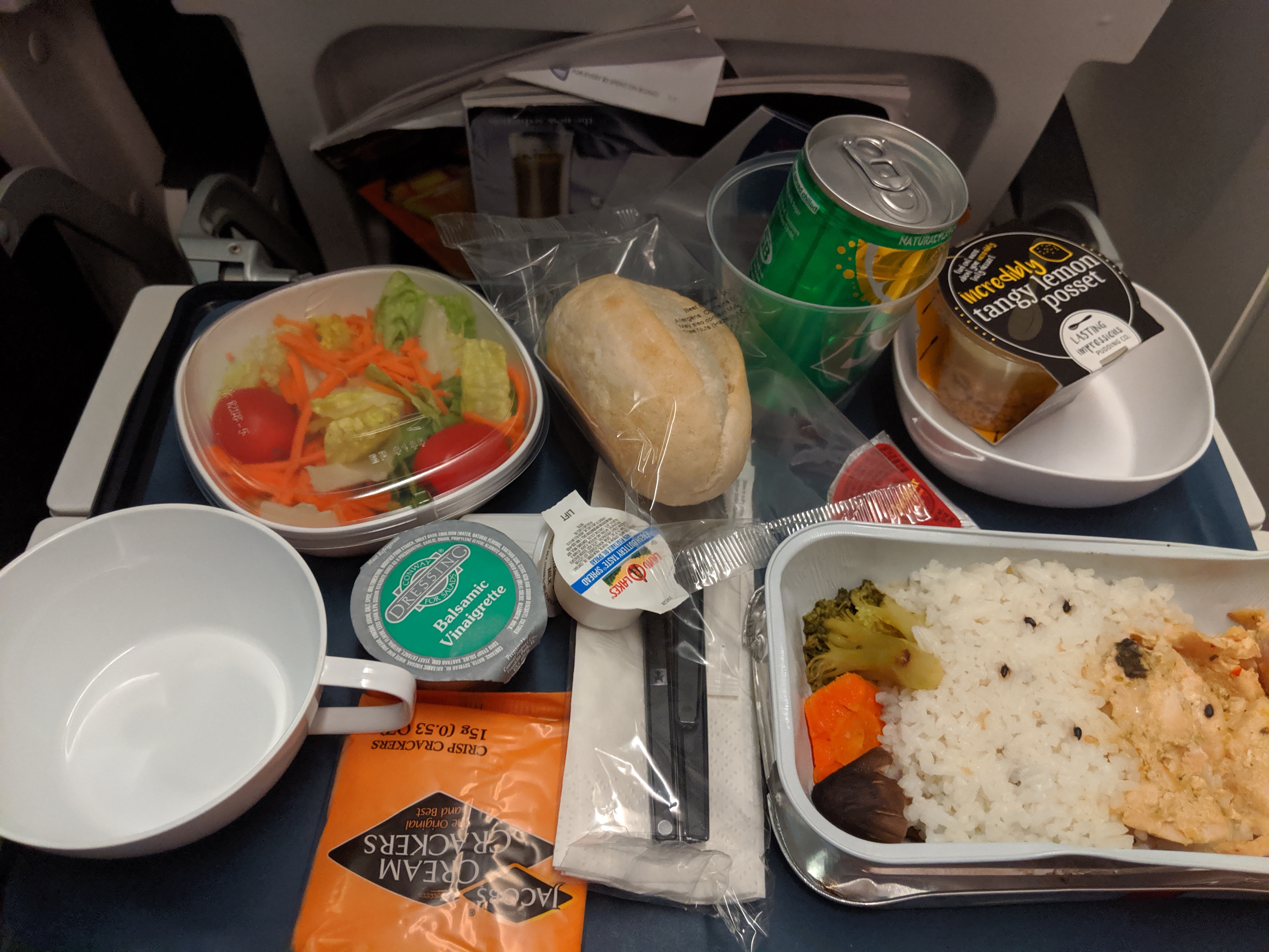They served the first mean about an hour and a half into the flight. I was really trying to exhaust myself so I stayed awake for it. They had what they called “red chicken curry” or the “vegetarian option” (I never did figure out what that actually was). I went with the curry; there was nothing “curry” about it, I never actually saw or tasted any curry – but it tasted really good. Simple salad, roll, dinner and some lemon custard, jello thing for dessert.
