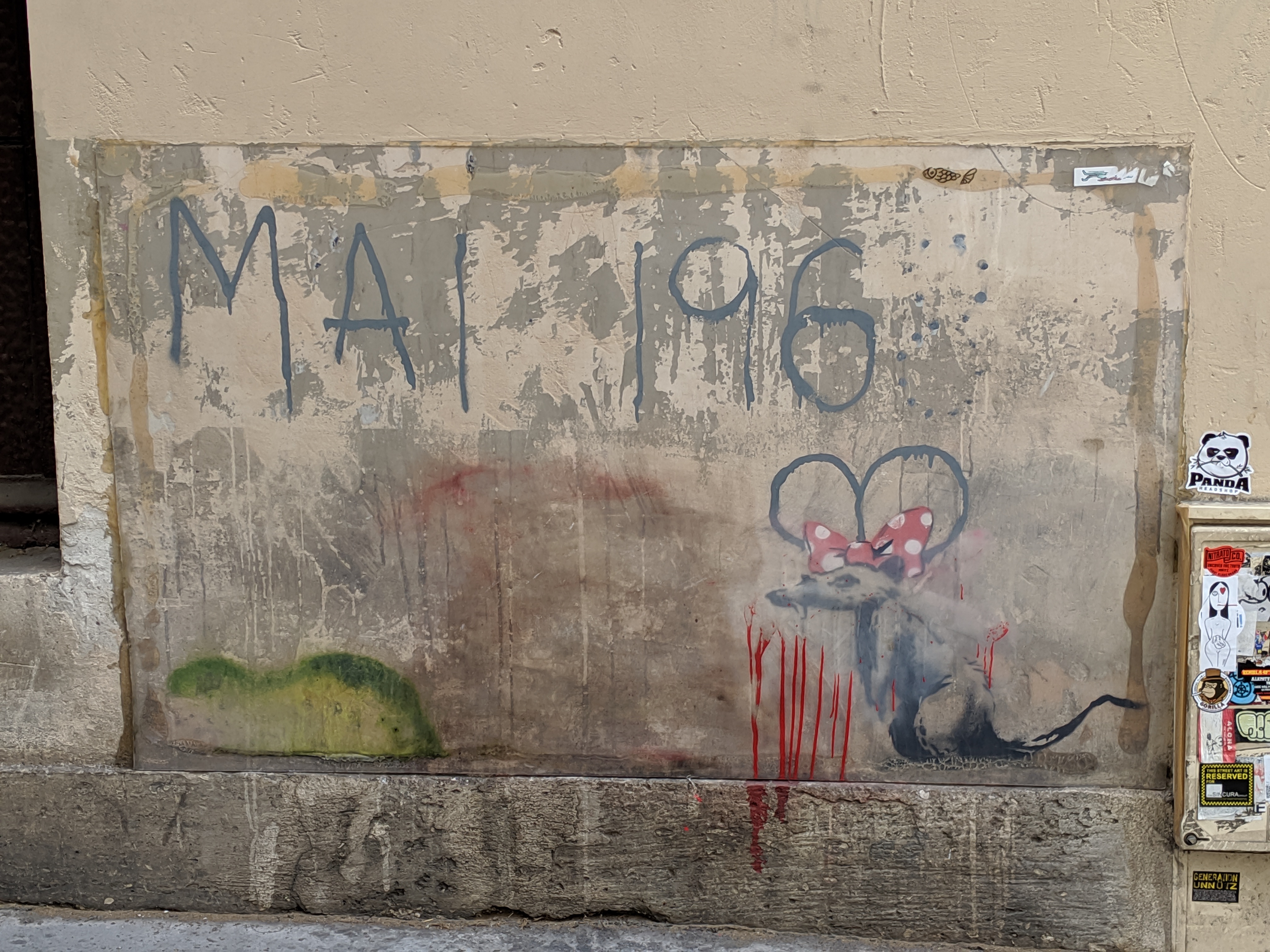 I decided to lunch in my room and then go back to Notre Dame to get a closer look. On my way to Notre Dame, I decided to check out an original Banksy. He is an anonymous street artist who has been brought to fame through his political and controversial art. I brought my phones and my Kindle and headed out to Notre Dame. My hotel is only like a 15 minute walk over there. The Banksy was on the way, so I snapped a picture and continued on.