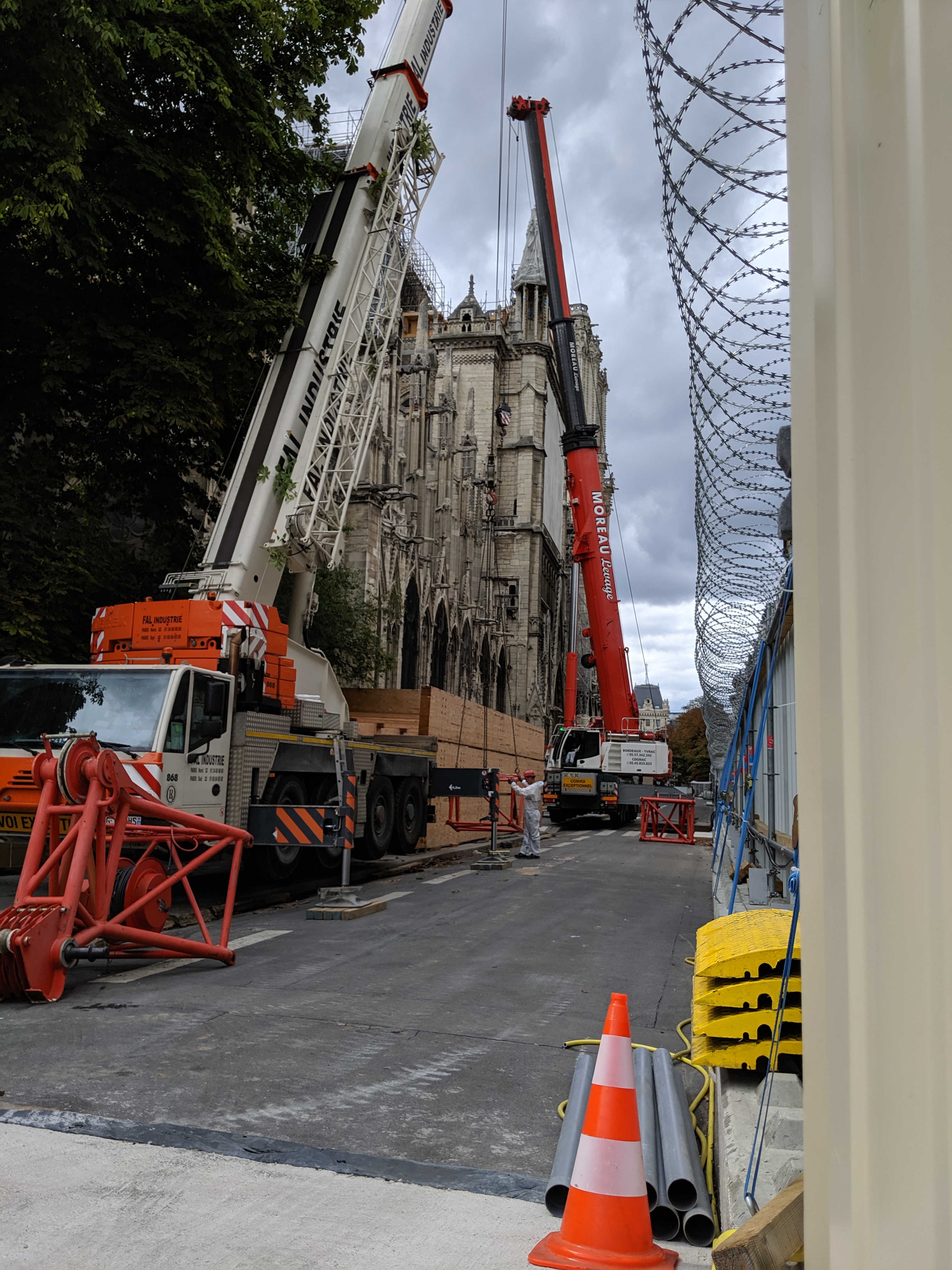 On the south side of the cathedral you can get a bit closer, but on the east side you can basically walk within 20 feet of the structure. Construction continues – today they were using cranes to build another crane. They have installed protection over all the windows and wooden support for portions of the structure. I stood in awe for a while – took some pictures and realized my phone’s camera was acting up.