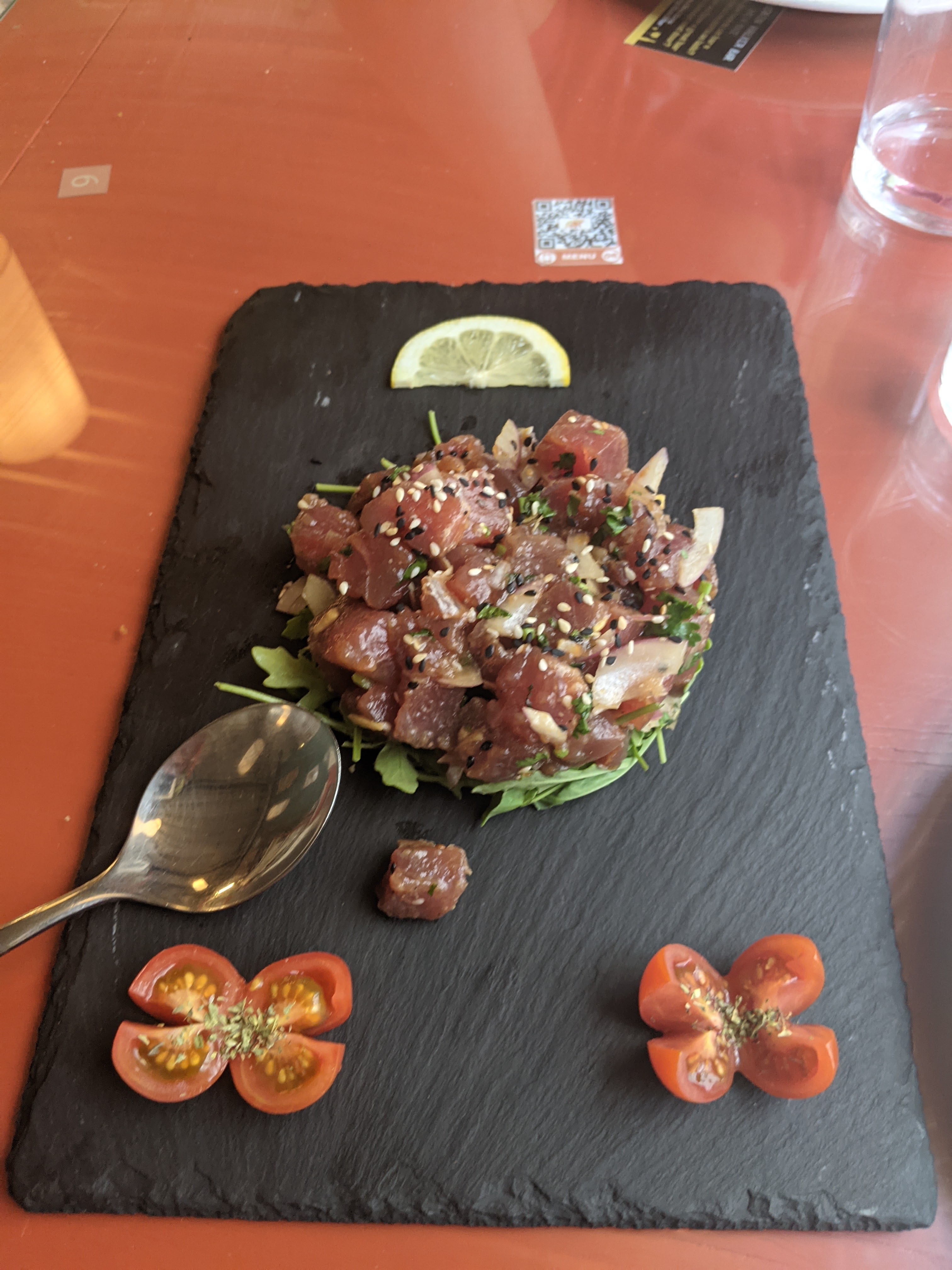 We got a nice window seat and sat down to enjoy our meal. The staff was amazing, service was great and food was flavorful! It is supposed to be tapas style, but Chris doesnt like fish and I dont like meat. So instead, we just ate our own main course and shared others. He even got to cook his veal on a grill at the table!