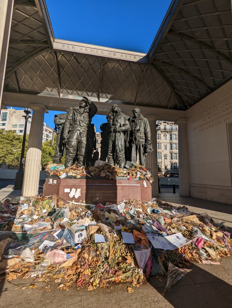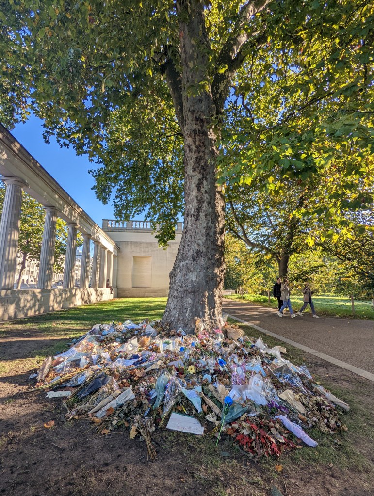 I watched the lead runners head towards the palace and continued to walk around the area. I found a WWII airman memorial that still had flowers and notes to the Queen. I also found a large tree with flowers and notes to the Queen, it was pretty clear that she was a figure held high in people’s minds. It makes sense since she was around for so long, however, she also oversaw a lot of the UK’s colonization so she did have some controversy.