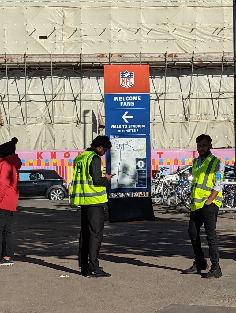 Around 930 I headed back to the tube to Tottenham for the game. I figured I’d walk around the neighborhood and find a bag drop. I got to the Tottenham station around 10am and started the 30-minute walk to the stadium. It’s in the middle of a neighborhood that pops up out of nowhere. The NFL had arranged for signs everywhere to give you directions and time to the stadium along the route so it was nice to have that and not have to use my phone for directions. The first official NFL item that was offered on the street was the program and a game scarf. I bought both and put them in my backpack so I wouldn’t take them into the game. I immediately found the bag drop and dropped off my backpack (which sadly included my water bottle). I asked them if the queue was long after the game, and they said yes and maybe it could take an hour. I figured that was fine and I wouldn’t have an issue with that wait.