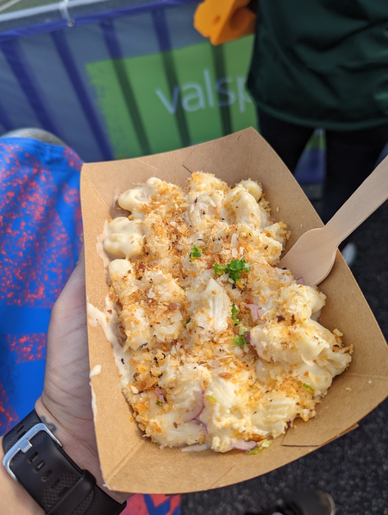 After the store, I headed to check out the rest of the neighborhood. They had a Packers doubledecker bus I took a selfie in front of and then found a food truck park that had some good food options in it. The NFL goes all out for these events, there was a DJ and games in the park. I managed to find macaroni and cheese!! Seemed perfect. I ate that and people watched and figured Id go get in the queue by the gate so I could be ready when the doors opened at 1230. Well, they decided to let people in at noon instead. I was on the upper level and learned the only way up is stairs – so up I went, and it was a lot, seven stories worth! I was able to take a great picture of a basically empty stadium before the game.
