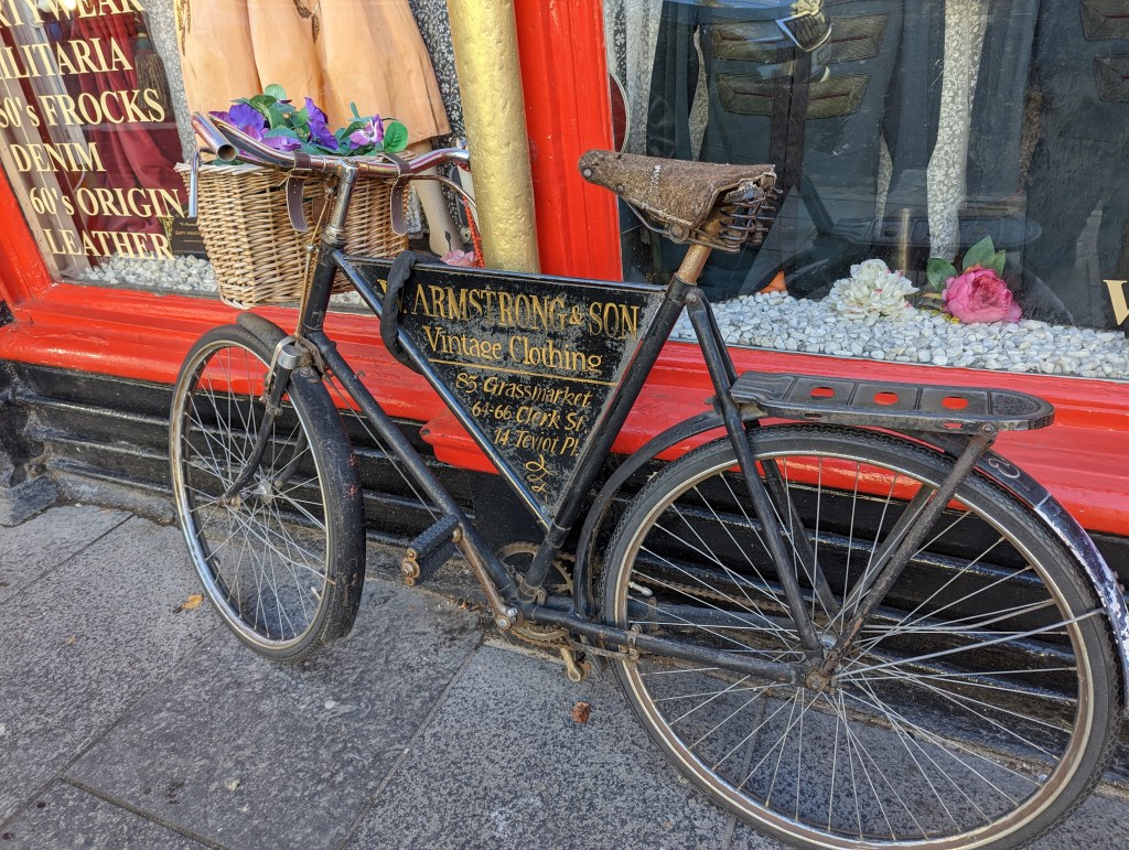 After the Castle, we headed back to the Grass Market to shop and get lunch. One thing we learned pretty quickly – nothing is open in the morning. Even at 11am things are not open. Lauren and I are just mind-blown about how few hours things are open (minus petrol and grocery stores). We decided on lunch and I made a reservation (almost always required in this country), which left us about 90 minutes to shop around. We went into a vintage clothing store first and Lauren was in heaven! There was so much random clothing, of course, kilts and sport coats, but also t-shirts and track suits! Anyway, Lauren found a Burbury trench coat that fits just sooooo well!! So she bought it! We looked around the store for a bit longer then headed up the hill for more stores on our way to lunch.